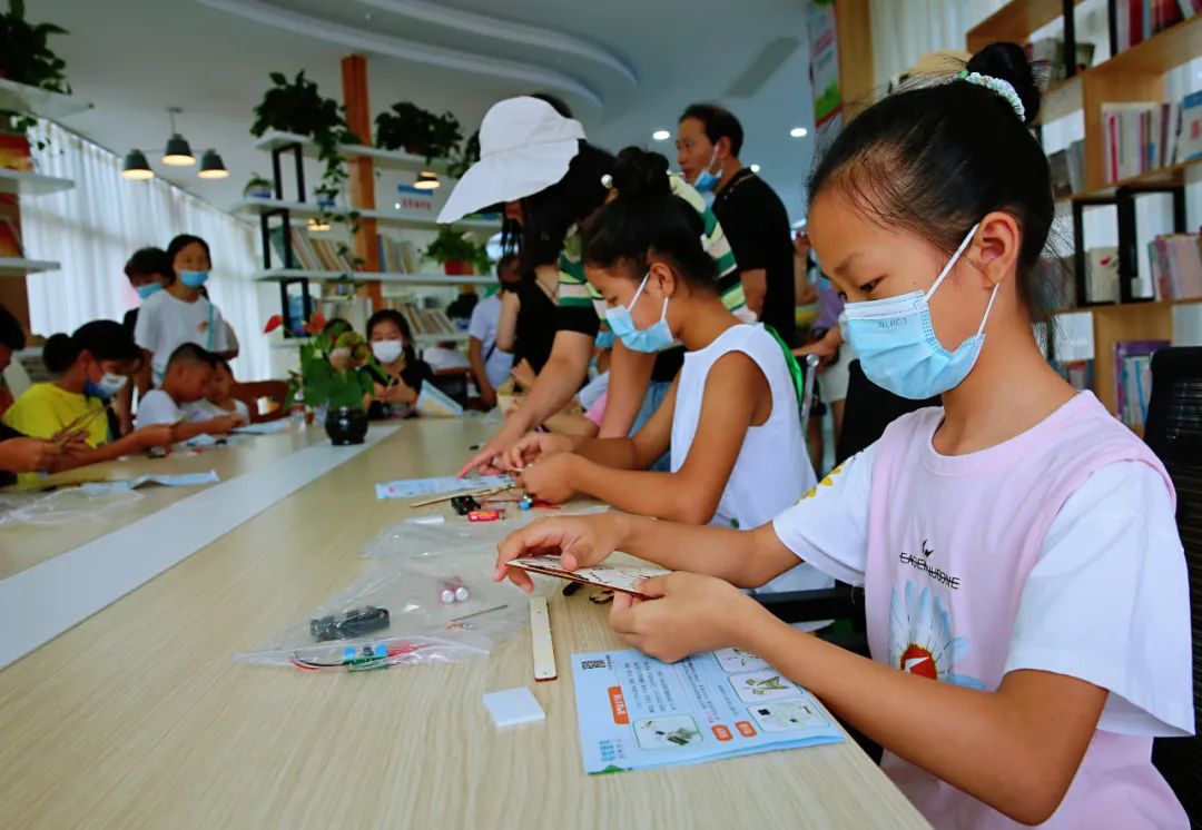 科普志愿者向小朋友講解螺旋槳飛機飛行的科學(xué)原理,小朋友動手制作“空氣動力飛機“模型。