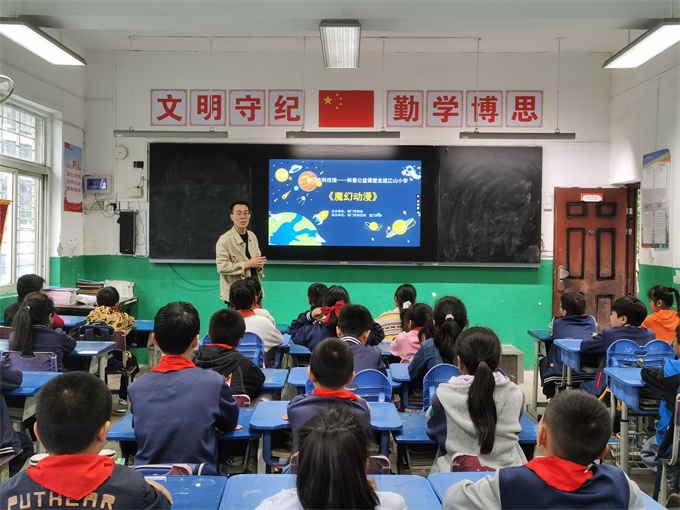 在江山小學(xué),科普志愿者們拉起活動橫幅,擺好宣傳展板,通過志愿者講解及科普課堂等形式,為全校師生送去了豐盛科普知識大餐。