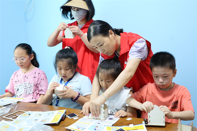 “同學(xué)們,你們知道生活中哪些物品是利用太陽能發(fā)電的嗎?”在親子科學(xué)制作環(huán)節(jié)中,科普志愿者引導(dǎo)大家了解太陽能量的轉(zhuǎn)化原理,并帶領(lǐng)大家制作“太陽能時鐘”。青少年們興致勃勃,按步驟搭建太陽能時鐘的小房子、連接電路、安裝太陽能電板。當手機電筒的光線照射到太陽能板上時,小房子上的時鐘立刻運轉(zhuǎn)起來??吹阶约旱某晒晒\轉(zhuǎn),青少年們滿臉自豪。