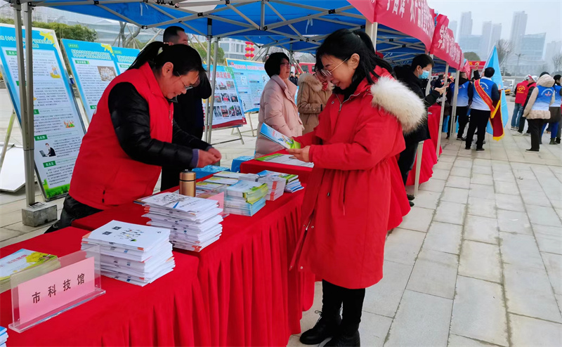 科普志愿者向市民發(fā)放科普讀物和反邪教宣傳資料。