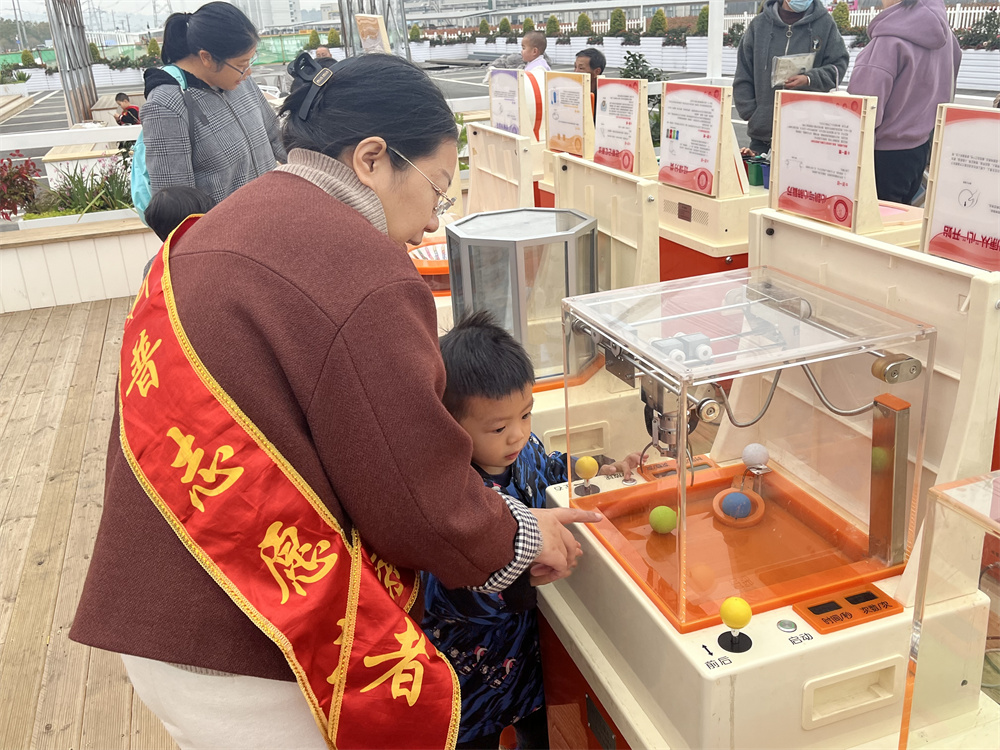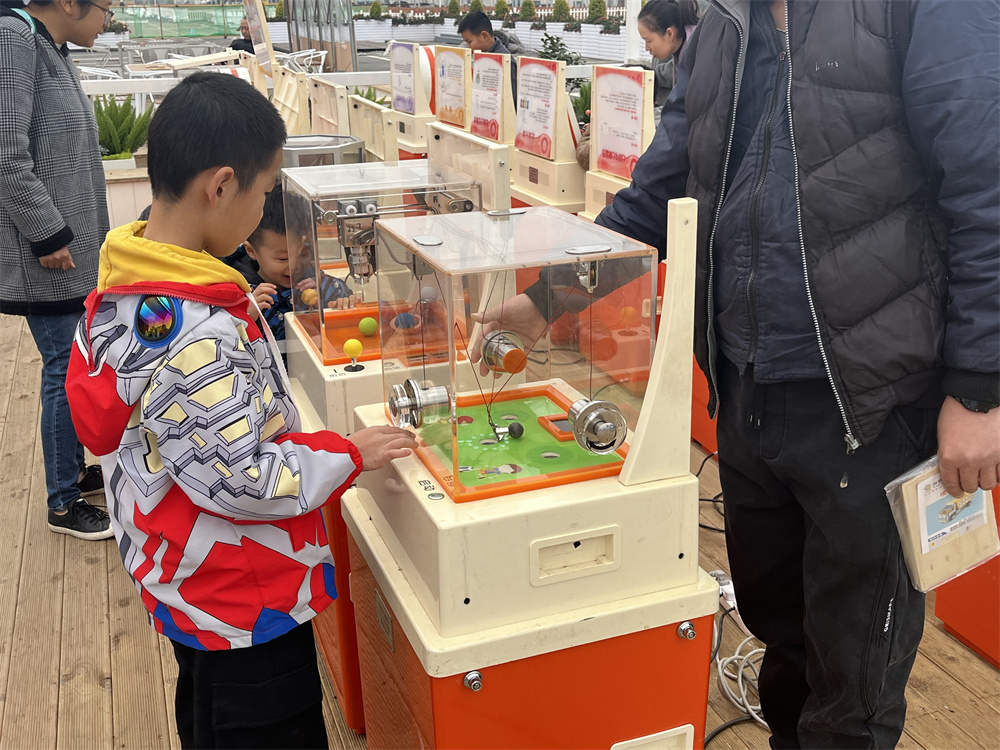 官堰湖木屋風情街位于荊門高新區(qū)鋰電片區(qū)內,是園區(qū)企業(yè)員工玩樂休閑的聚集地。得知開展科普活動的消息,一大早便陸陸續(xù)續(xù)有家長帶著孩子來參加。有趣的科普大篷車展品總是能第一時間吸引孩子們的目光,“合作運球”“垃圾分類”“短期記憶測試”等科普展品,將科學原理通過直觀的方式呈現(xiàn)出來。孩子們在和家長動手操作展品的同時,能夠對科學產生濃厚的興趣,并主動了解相關的聲、光、電、磁、力等科學知識。